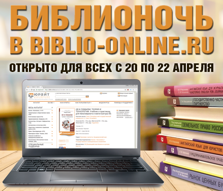 Издательство «Юрайт» решило принять участие в мероприятии и открыть полный доступ в электронную библиотеку www.biblio-online.ru для всех посетителей на три дня - с пятницы 20 апреля по воскресенье 22 апреля! Вам нужно зарегистрироваться или авторизоваться, чтобы прочитать любую понравившуюся книгу.