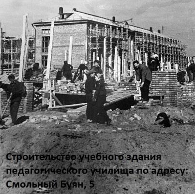Я на фотографии узнала директора училища Петра Васильевич Верещагина. Ему еще 56 лет, он полон энергии, у него множество планов. Только что воплотилась в жизнь его мечта, в 1958 году открыто музыкально-педагогическое отделение. Дальше он приступит к осуществлению грандиозного замысла: строительству нового учебного корпуса (ул.Смольный Буян, 5). Прилагаю две фотографии, которые показывают историю его строительства. Кстати, в 1959 году студенты и педагоги ютились в небольшом деревянном здании, которое располагалось на углу улиц Чумбарова-Лучинского и Энгельса (Воскресенская). Чумбаровка в те времена была неприглядной и неухоженной. Наверное, поэтому место для выпускной фотографии выбрали иное: близкое по расстоянию, но внешне привлекательное. Думаю, старожилы узнали, что снимок сделан на фоне здания главпочтамта.
