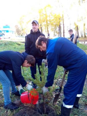 Сосны нам выкопал и привёз Голубев В.В. А мы постарались разместить их на территории фасада 2 учебного корпуса. К соснам добавили немного кустов спиреи двух видов: рябинолистной и дубравколистной. Волова Ж.А. подарила декоративную ель - на территории для неё тоже нашлось место.