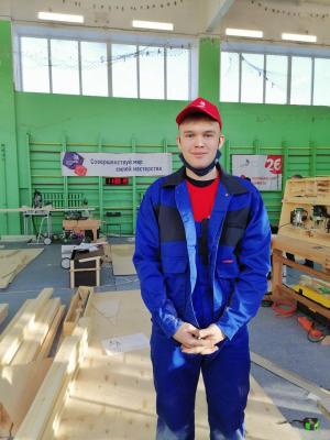Власов Антон, студент 2 курса по профессии «Мастер столярного и мебельного производства», участвует в чемпионате по компетенции «Плотницкое дело». Наставником Антона является мастер производственного обучения Алексей Николаевич Пускозеров. Антон уже имеет опыт участия в чемпионате, держится уверено и наслаждается работой на конкурсной площадке.