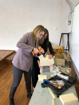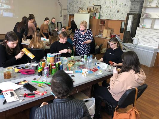 А затем началось, наверное, самое интересное и увлекательное - студенты начали работу над своими проектами! Кто-то работал индивидуально, кто-то объединился в группы, все трудились не покладая рук, и абсолютно каждый присутствующий был задействован в каком-либо процессе. Каждый студент или группа студентов воплощали в реальность свои уникальные и неповторимые задумки: перерабатывали бумагу, делали украшения из ниток, изготавливали поделки из жестяных банок, из деревянных брусочков, оставшихся после изготовления более крупных изделий и многое другое! В мастерской весь день кипела работа и царила невероятная атмосфера. Но впереди есть еще несколько дней, и нам предстоит выполнить много работы над своими проектами. Мы уверены, что у нас получится сохранить боевой настрой и успешно выполнить все поставленные задачи!
