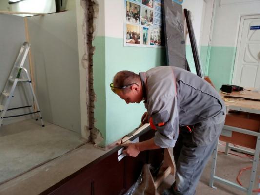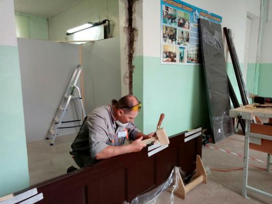 Во время практической части плотники в течение семи часов должны демонтировать существующий дверной блок, изготовить и смонтировать дверную коробку, заполнить зазоры и стыки монтажной пеной, навесить полотна и установить ручки и шпингалеты.