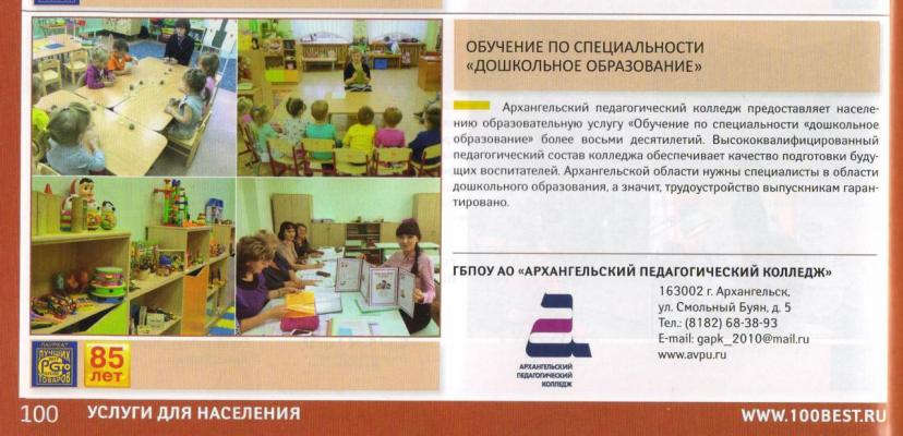 Результаты Всероссийского конкурса «100 лучших товаров России-2017» обнародованы в каталоге. Архангельский педагогический колледж, победитель и призёр в номинации услуги для населения, представлен на страницах 100-101.