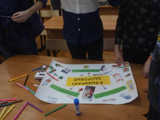 В качестве мастер-класса работы волонтёров, для школьников было проведено меропряитие "Пирамида здоровья". Волонтёры центра "Надежда" - студентки Архангельского педагогического колледжа Сергеева Анна и Бахтиярова Вика, при помощи Басовой Марии рассказали ребятам о составляющих ЗОЖ, особенностях здорового жизненного стиля в разных странах и организовали создание мотивирующих коллажей.