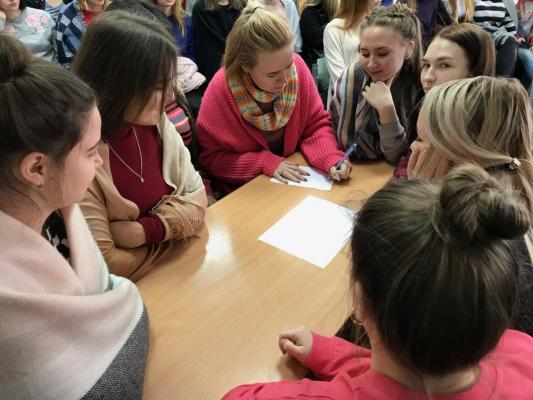 Это соревнование. Столкновение знаний о выпускнице Архангельского педагогического училища, имеющихся у студенток групп 31(9) и 34 отделения педагогики. Впервые в истории этих встреч конкурировали две специальности: преподавание в начальных классах и дошкольное образование!