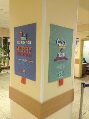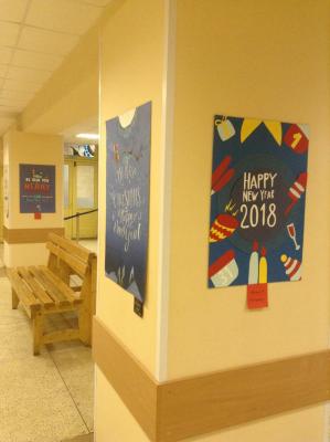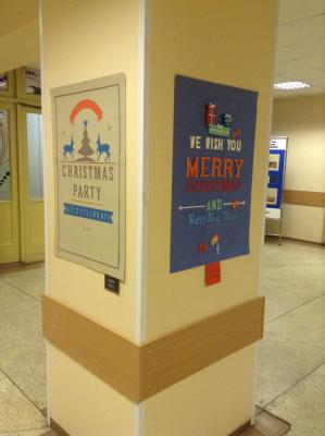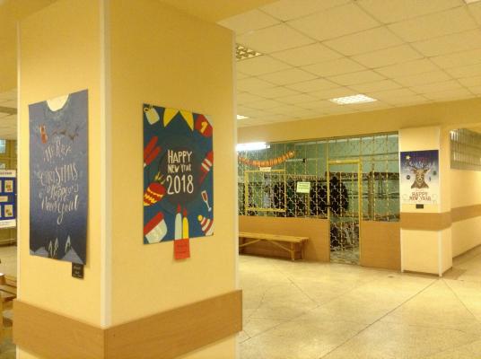 Холл второго корпуса вновь оформлен плакатами к Новому году! Плакаты были выполнены студентами 1 курса в рамках изучения шрифтоведения группой исполнителей художественно оформительских работ. Руководитель Старицын Кирилл Альбертович.