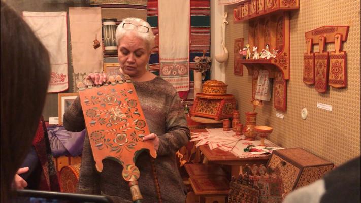 Галина Федоровна провела со студентами и экскурсию в музее, где представлено большое количество разнообразных экспонатов. Она рассказала об изделиях, их особенностях, людях, которые их сделали. Это поможет студентам сориентироваться при подготовке второй экскурсии.