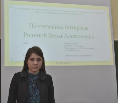 Именно так называлось сообщение обучающейся группы 21(9) Шонбиной Русланы, которая выступила перед студентами группы 2ф(9) специальности «Педагогика дополнительного образования». Руслана поделилась с первокурсниками итогами своего исследования, связанного с творческой стороной жизни преподавателя истории Архангельского педучилища. Как выяснилось в ходе выступления Русланы, студенты группы 2ф(9) уже знакомы с фактами биографии Веры Алексеевны, и новый аспект её жизни вызвал неподдельный интерес у слушателей. Благодарим Шонбину Руслану за интересный и познавательный рассказ!