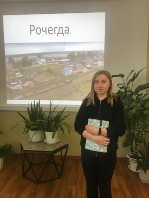 В этом году с рассказом о населённых пунктах архангельского Севера выступили те студенты, которые влились в группы с сентября 2019 года. Кожевина Анастасия (группа 14(9)) приехала к нам из Нарьян-Мара. Чувствуется, что Настя очень любит свой город, знает его. Семакова Евгения (группа 14(9)) начала своё выступление с трансляции песни о родной Рочегде (Виноградовский район). Посёлок на правом берегу Северной Двины был основан в 1939 году поляками из расположенного здесь гулаговского лагеря и крестьянами близлежащих деревень. Женя утверждает, что название посёлка имеет польские корни. В нём жили лесозаготовители, и до недавнего времени там имелась узкоколейная железная дорога.