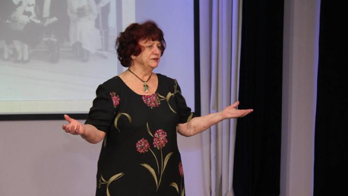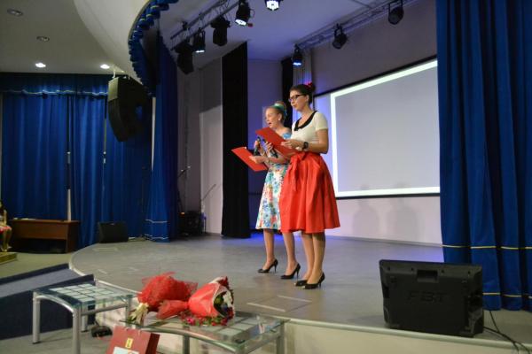 Валентина Тимофеевна Старицына, только преданный друг колледжа может бросить все дела в Санкт-Петербурге и по первому зову примчаться на 85-летие колледжа, чтобы вместе с концертмейстером Натальей Николаевной Тихомировой в поэтической форме напомнить залу о 60-летнем юбилее педучилища.