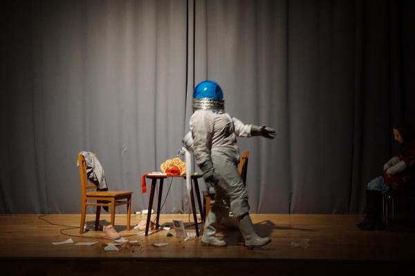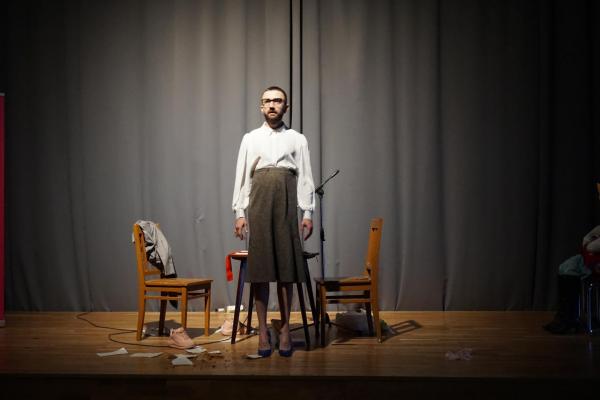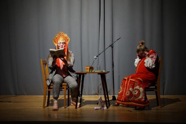 Теперь о других странностях. В самом начале спектакля беременная девушка в кокошнике пять минут вытаскивала из зала тяжеленный большой стол (о том, что это Лида, мы поняли потом). Ничего другого на сцене в это время не происходило. Несколько позже на сцене солировал молодой человек с ведром и шваброй. Он натуральным образом начал мыть пол на сцене, перед ней и в зрительном зале, и делал это тоже минут пять. Во время спектакля герои периодически громко, захлёбываясь, кричали, пили водку, крошили на пол хлеб и потом ходили по нему, Лидка, отвернувшись, переодевалась в сарафан и вышитую сорочку. Алька появилась в солнцезащитных очках, кажется, у неё была, выражаясь культурно, гематома на левом глазу. В начале и в конце спектакля выступил ранее упоминавшийся Некто. Плюс ко всему, было не понятно, о каком времени идёт речь.