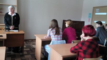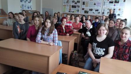 Обучающиеся группы 1(9), их классный руководитель Е.В.Молчанова встретились в музее истории колледжа с Нинель Ивановной Шороховой. Детские годы Нинель Ивановны совпали с войной. Она, объективный свидетель военной эпохи, поделилась с юными слушателями своими воспоминаниями. Детальный рассказ о суровом военном детстве в Архангельске не оставил никого равнодушным. Запомнились и проникновенные стихи-воспоминание в исполнении автора.