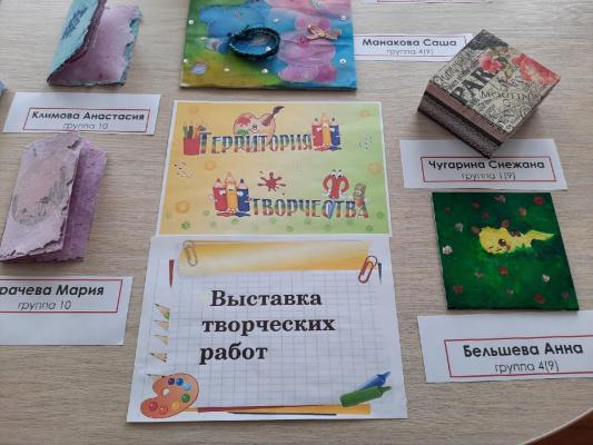Выставка «Территория творчества» организована и проходит с 23 марта 2021 года в библиотеке колледжа, 2 учебный корпус. Здесь представлены творческие работы студентов — рассказы, рисунки, фотографии, часы, мягкие игрушки и.т.д. Наши первокурсники активно поддержали Елену Владимировну Сорокину, преподавателя колледжа, предложившую им принести свои лучшие произведения для организации выставки.