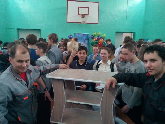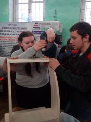 По профессии «Мастер столярного и мебельного производства» был представлен мастер-класс по изготовлению мебели из ламината. Мастер Миролюбов Виктор Иванович и подмастерье Березин Антон (2м) легко справлялись с инструментами, как будто это продолжение их рук. Работа спорилась, школьники с интересом наблюдали и принимали активное участие в изготовлении табурета, полки, прикроватного столика и компьютерного стола. Заинтересованные школьники записывали адрес колледжа, фотографировались с инструментами и готовыми изделиями.