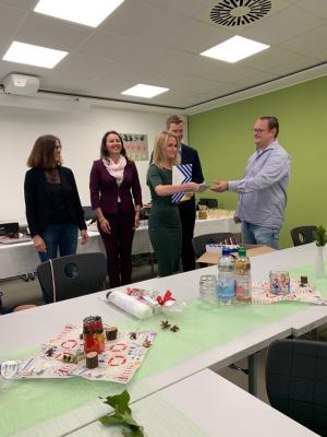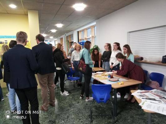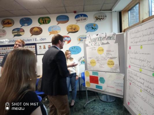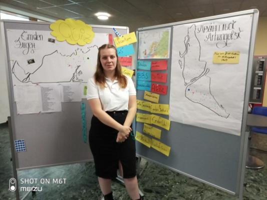В среду состоялась презентация итогов проекта "Развитие города через молодежные обмены: территория города глазами молодежи" в форме ярмарки возможностей. Одна из групп проводила языковую анимацию, другая отобразила всю историю молодежных обменов городов Архангельска и Эмдена, третья показала, каким должен быть молодежный парламент Эмдена, четвертая сравнила возможности развития молодежи городов-побратимов, пятая провела опрос среди учащихся Профессиональных школ №1, результаты которого были озвучены бургомистру Эмдена. Следует отметить, что русские и немецкие студенты не только рассказывали о своих результатах, но и угощали гостей конфетами, испеченными блинами и пирогами.