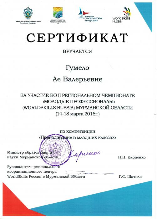 Сертификат за участие в региональном Чемпионате Молодые профессионалы Гумело Ае