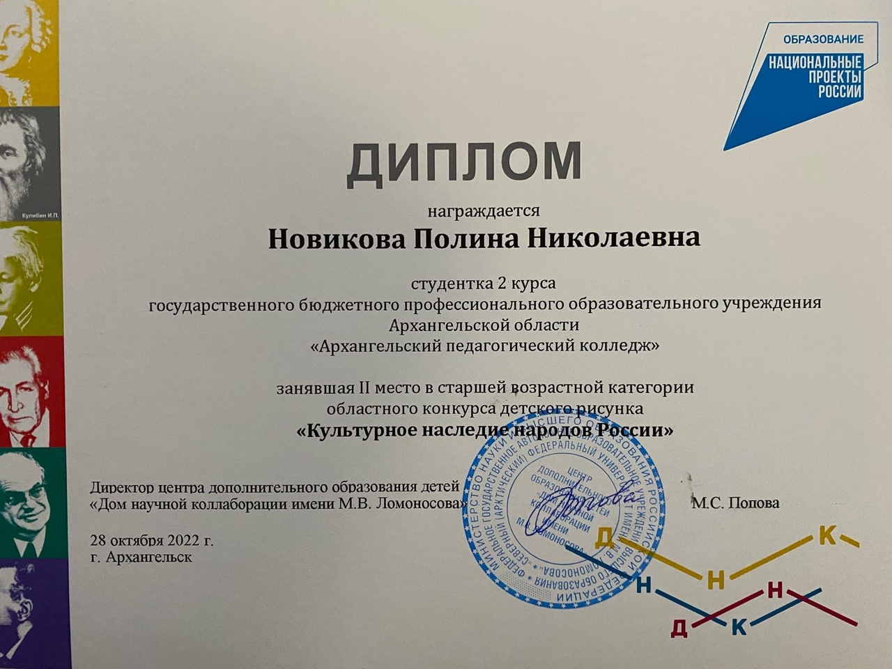 Дом научной коллаборации подвел итоги областного конкурса рисунка «Культурное наследие народов России» в рамках фестиваля науки. Студентка группы 19 Дизайн (по отраслям) Новикова Полина заняла 2 место в старшей возрастной категории. Для участия в конкурсе она выполнила натюрморт с предметами быта Поморья: мезенская роспись на берестяном туесе, деревянная утварь, расшитое полотенце. По итогам конкурса в главном корпусе САФУ оформлена выставка рисунков, победителям и призерам вручены памятные подарочки. Поздравляем Полину с почетным призовым местом!