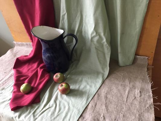 Для выполнения творческой работы предлагается натюрморт. В постановку натюрморта входит три предмета из различных материалов, одна или две драпировки.